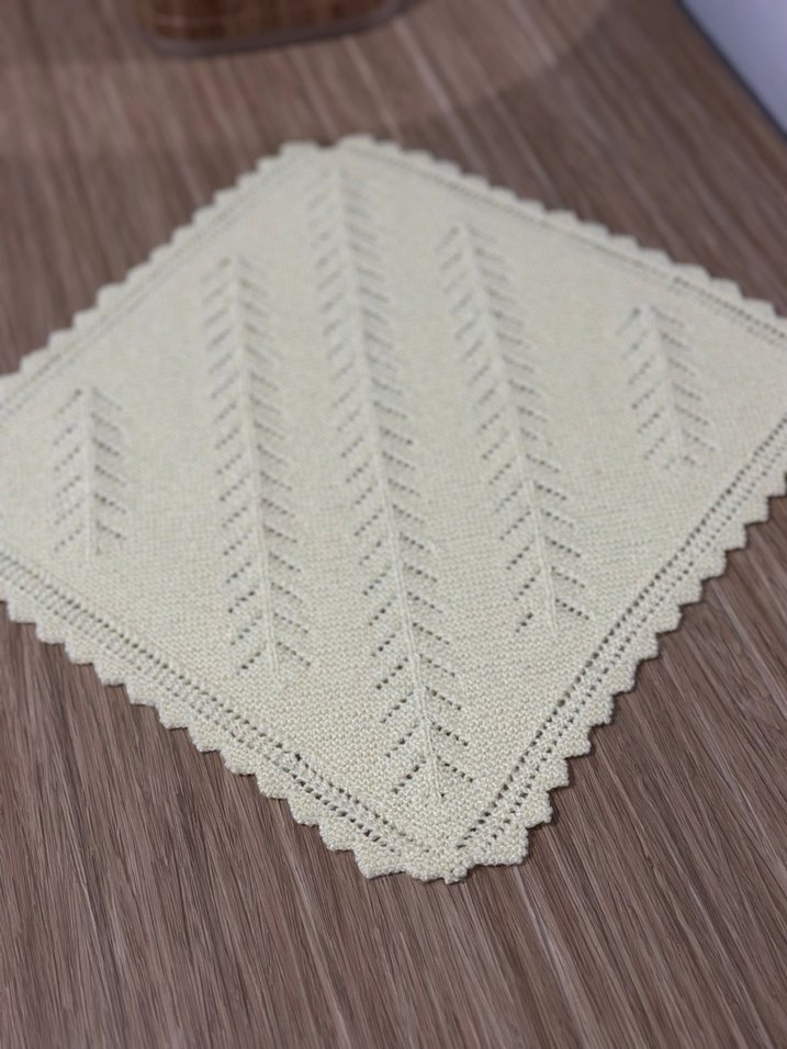 Yaprak desenli ve kenarları dalgalı bej renkli örgü battaniye, yumuşak ve rahat dokusuyla dikkat çeker. Sipariş alınır şiş lifi