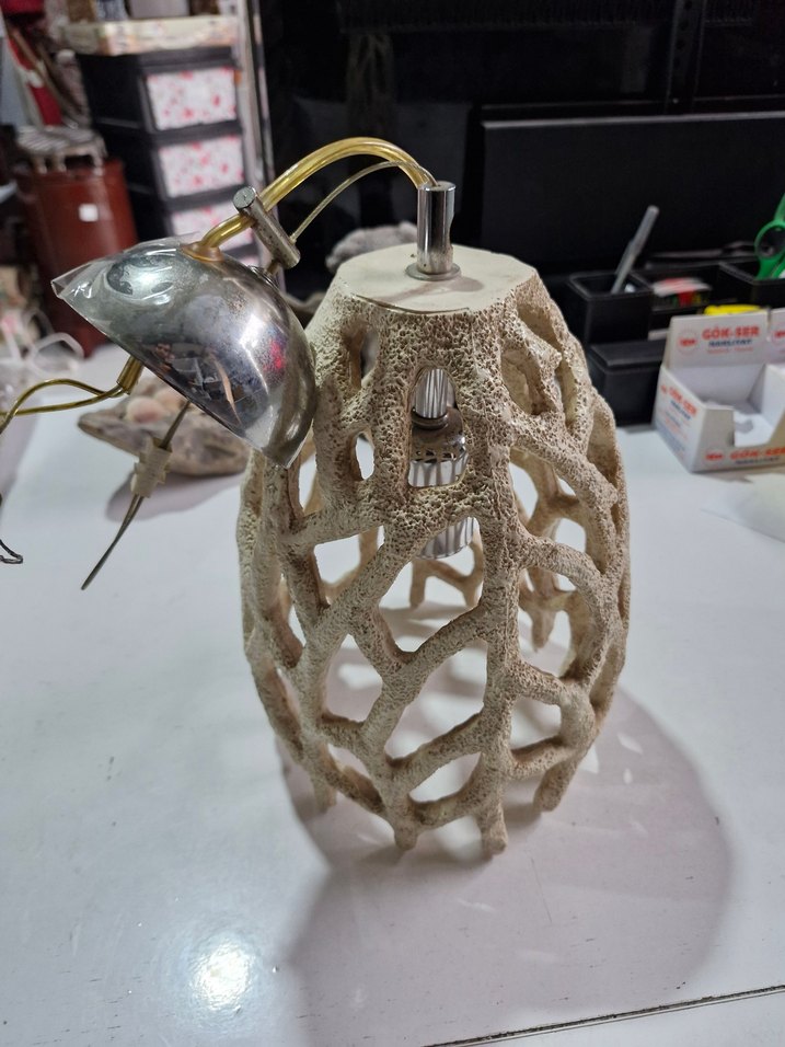 Bej renkli, örgü desenli açık tasarıma sahip masa lambası, metal aparatıyla ortam aydınlatması sağlar.