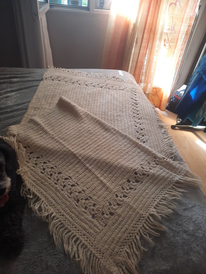 Dokulu desensiz bej örgü battaniye, püsküllü kenarlarıyla sıcak ve konforlu bir his sağlar. ️