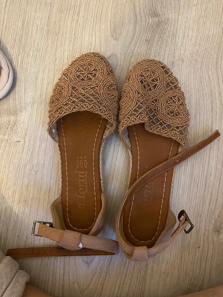 Bej renkte, nakışlı örgü ve dantel detaylı dolgu topuklu sandalet. Ayak bileği kayışı ile günlük kullanıma uygun, bohem tarzına uyumlu. Sayılı giyildi sorunsuz