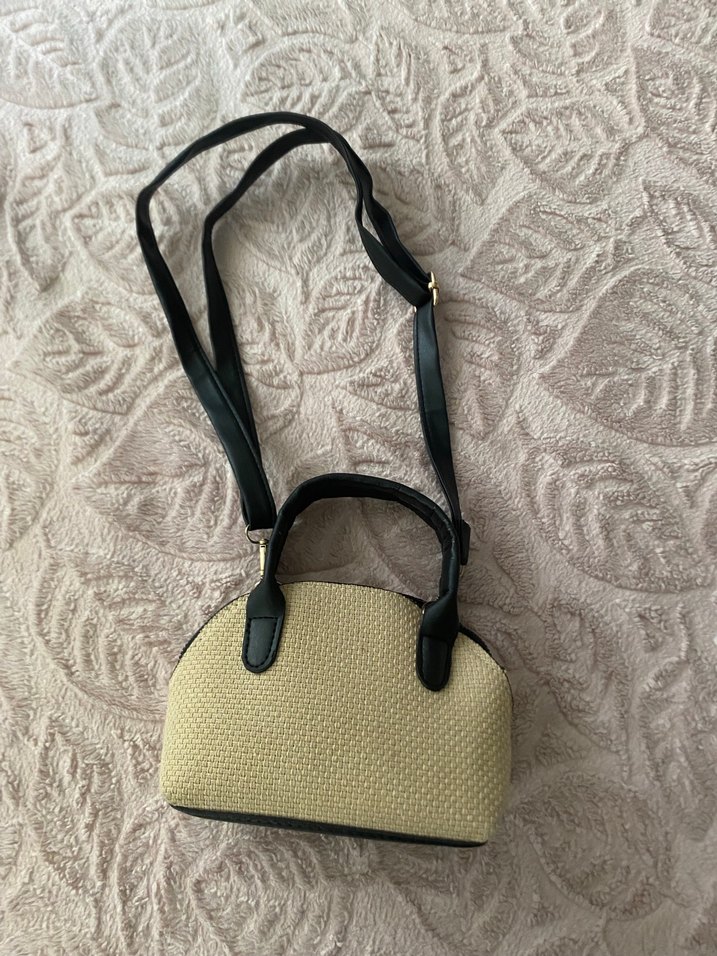 Bej renkte, örgü dokulu, siyah saplı ve ayarlanabilir askılı bohem tarzda kadın çantasıdır.