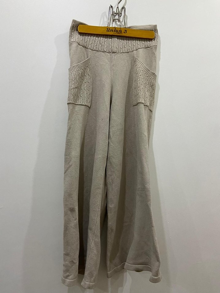 Bej keten pantolon, bol kesim ve örgü detaylı cep ve bel kısmıyla rahat ve bohem bir tarz sunar.