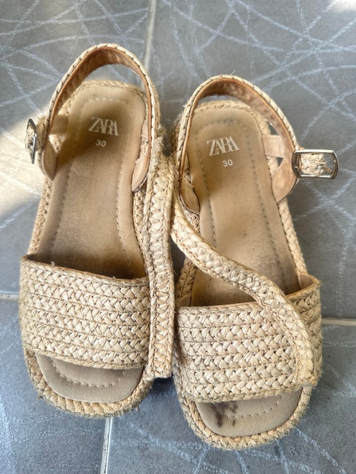 Bej renkli, örgü dokulu dolgu topuklu sandalet, tokalı bantlı ve minimalist bohem tarzda, günlük kullanım için uygundur. ZARA, 30 numara.