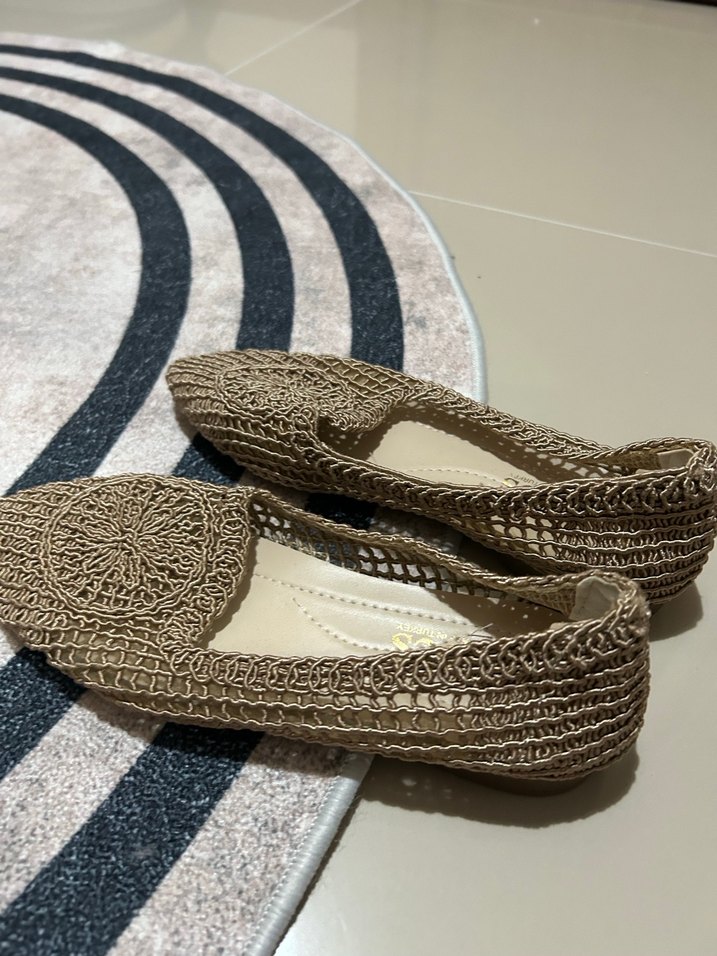 Bej Örgü Detaylı Kadın Espadril Topuklu Babet Hasır Babet