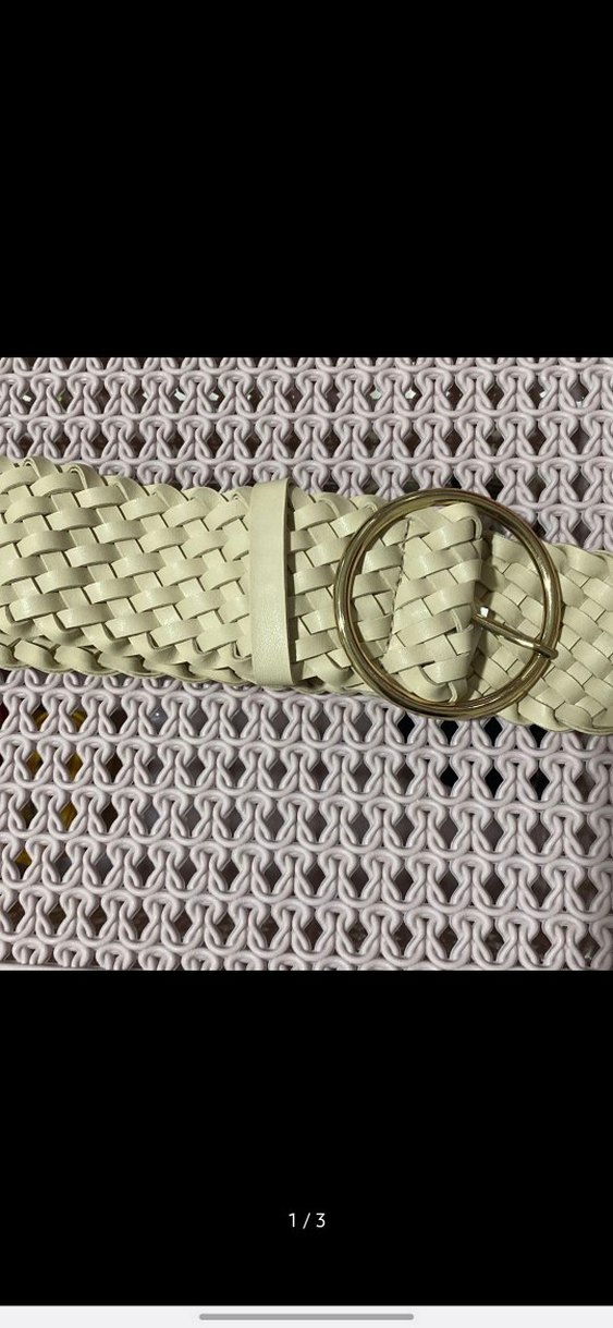 Yuvarlak metal tokalı, bej örgü detaylı kadın kemeri. Bohem tarzıyla retro görünüm sağlar.