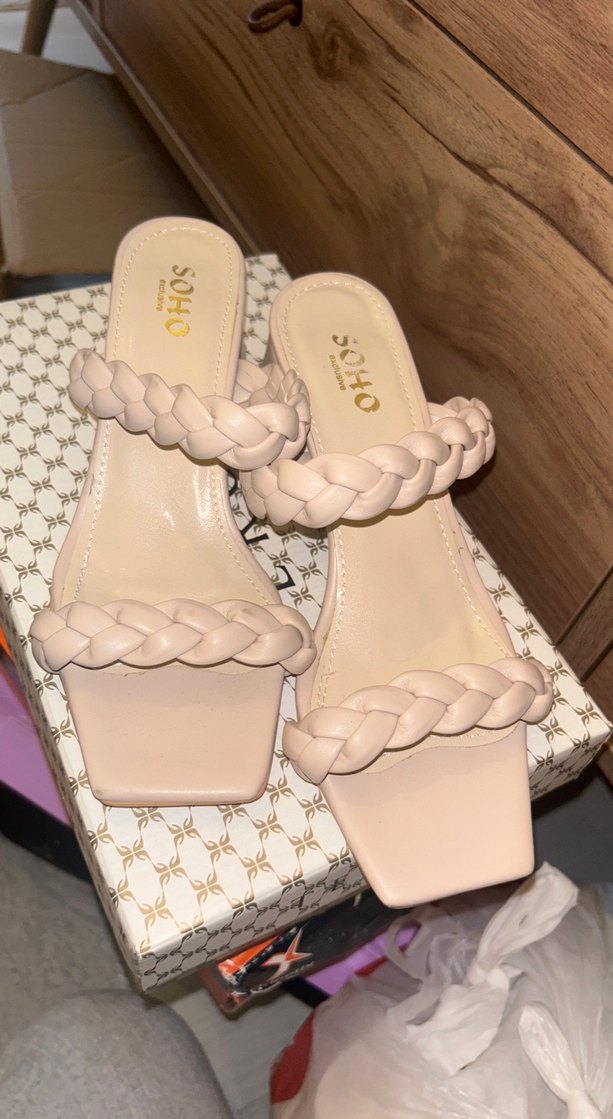 Bej renk, örgü bantlı ve tokalı blok topuklu kadın terlik. SOHO markalı, romantik akşamlar için uygun, trend şık tarzda. Hiç kullanılmadı