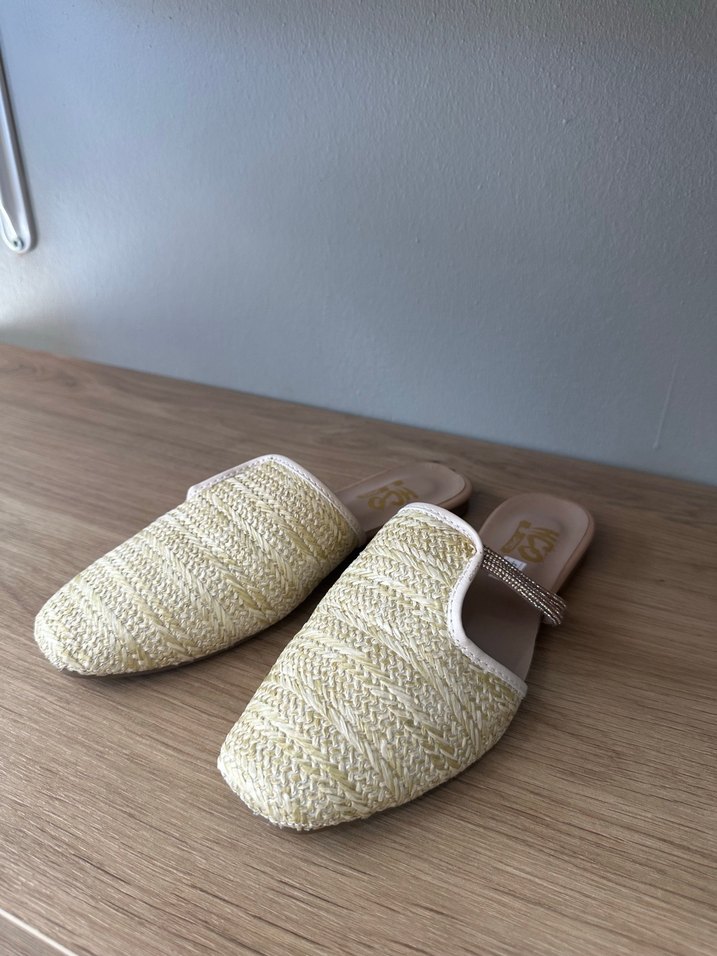Bej renkli, örgü dokulu kadın terlikleri, blok topuklu ve sade desensiz tasarımıyla günlük kullanım için uygundur.