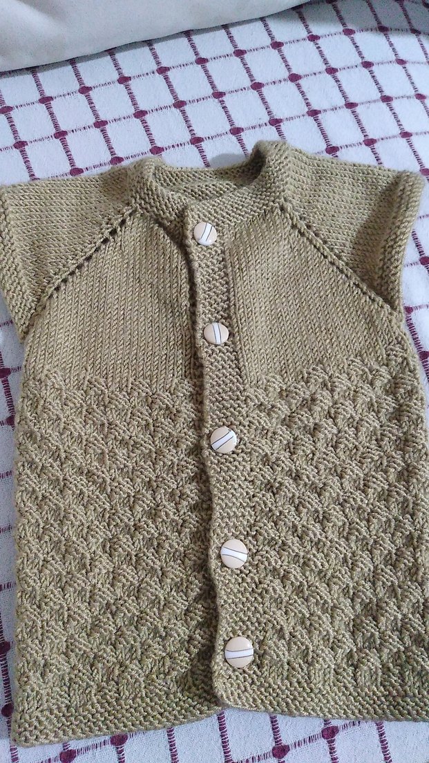 Bej renkli, örme, düğmeli, bohem tarzda, boğazlı ve kolsuz bebek yeleği. Orta boy ve vücuda oturan kesime sahip, günlük kullanıma uygun.