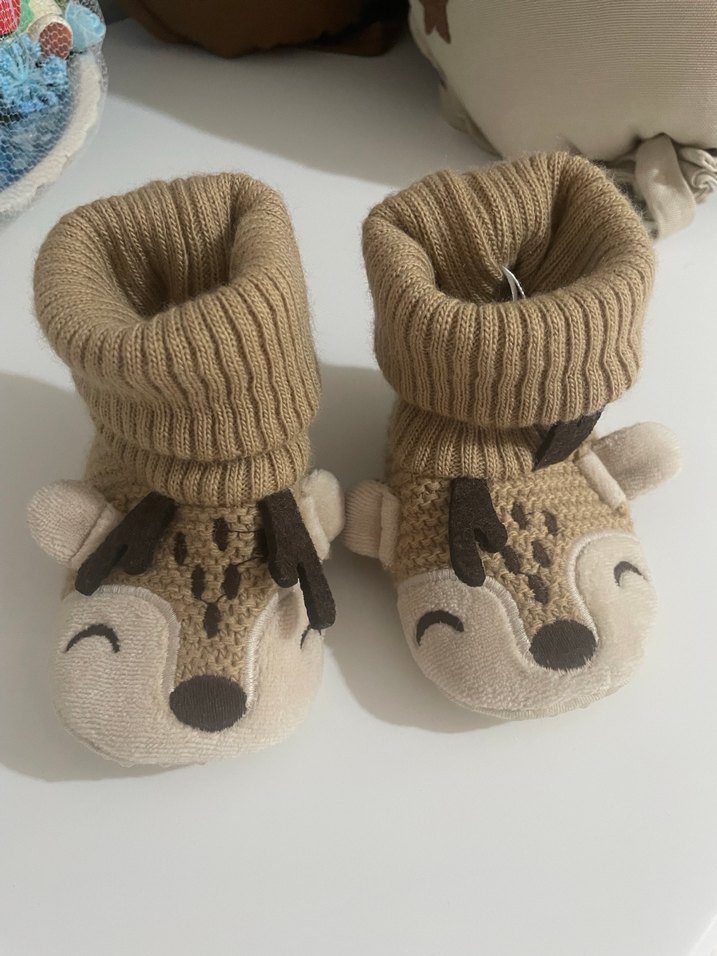 Bej renkli, örgü ve nakışlı hayvan figürlü erkek bebek patikleri, yumuşak örgü kumaştan yapılmıştır. Hiç giyilmedi