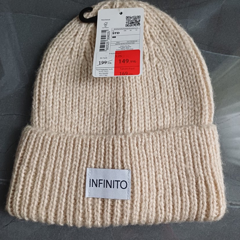 Yumuşak örgü kumaştan yapılmış bej erkek bere, sade tasarım ve INFINITO etiketi ile. Rahat sokak stili