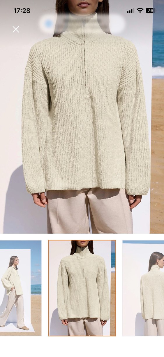 Bej renkli, yumuşak yün kumaştan örülmüş, uzun kollu ve bol kesim kadın kazak. Bi kaç defa giyilmiştir taytların üstüne uygundur.