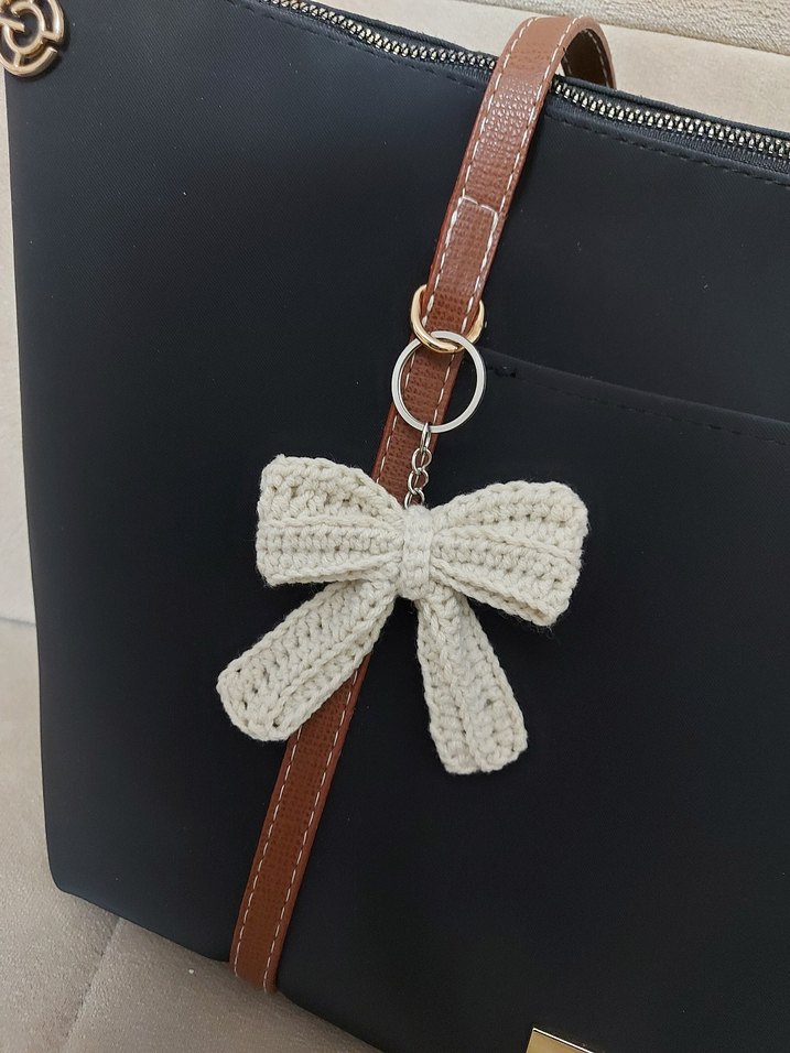 Hafif bej renkte, örgü fiyonk şeklinde, rahat ve bohem tarzda anahtarlık. Anahtarlarınıza veya çantanıza yumuşak ve şık bir dokunuş katar.