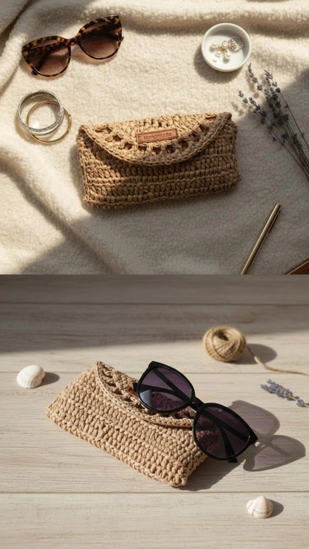 Yumuşak örgü kumaştan yapılmış bej renkli, minimalist ve bohem tarzda gözlük kılıfı. Günlük kullanım için uygun, desensiz tasarım.