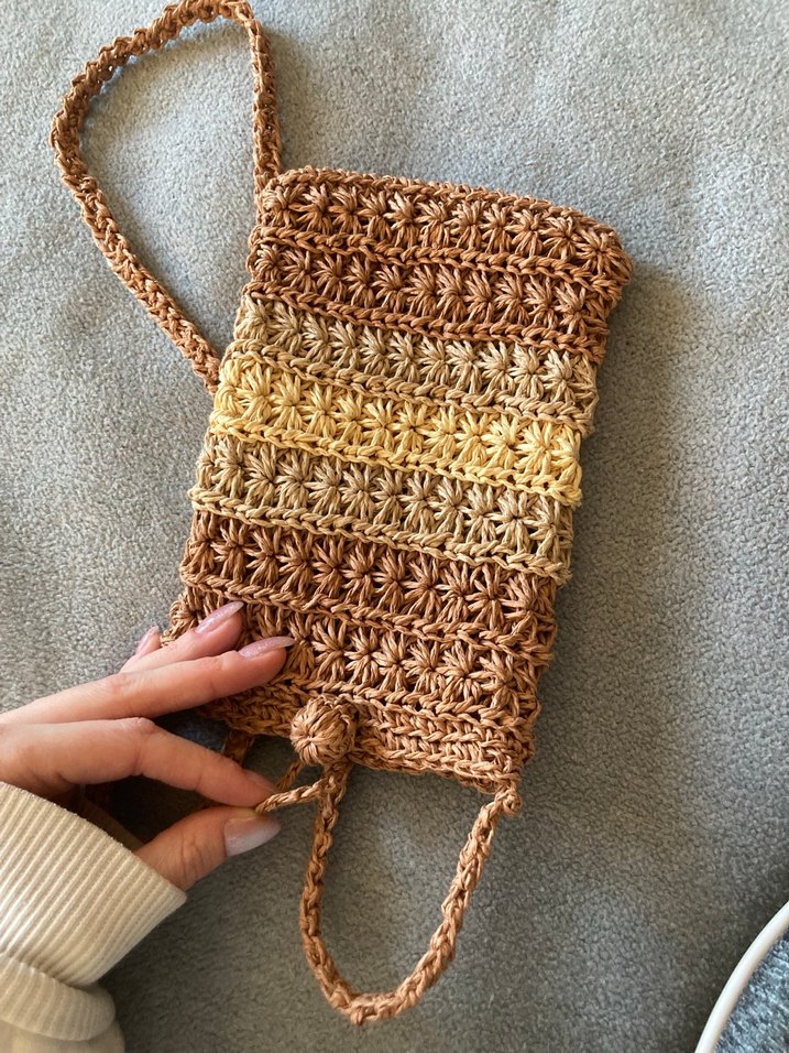 Örgü dokulu, açık bej tonlarında tie-dye desenli kadın çapraz çanta. Yumuşak örgü hasır, bohem tarzı ve günlük kullanım için uygundur. El emeğidir yazın kullanıma uygun