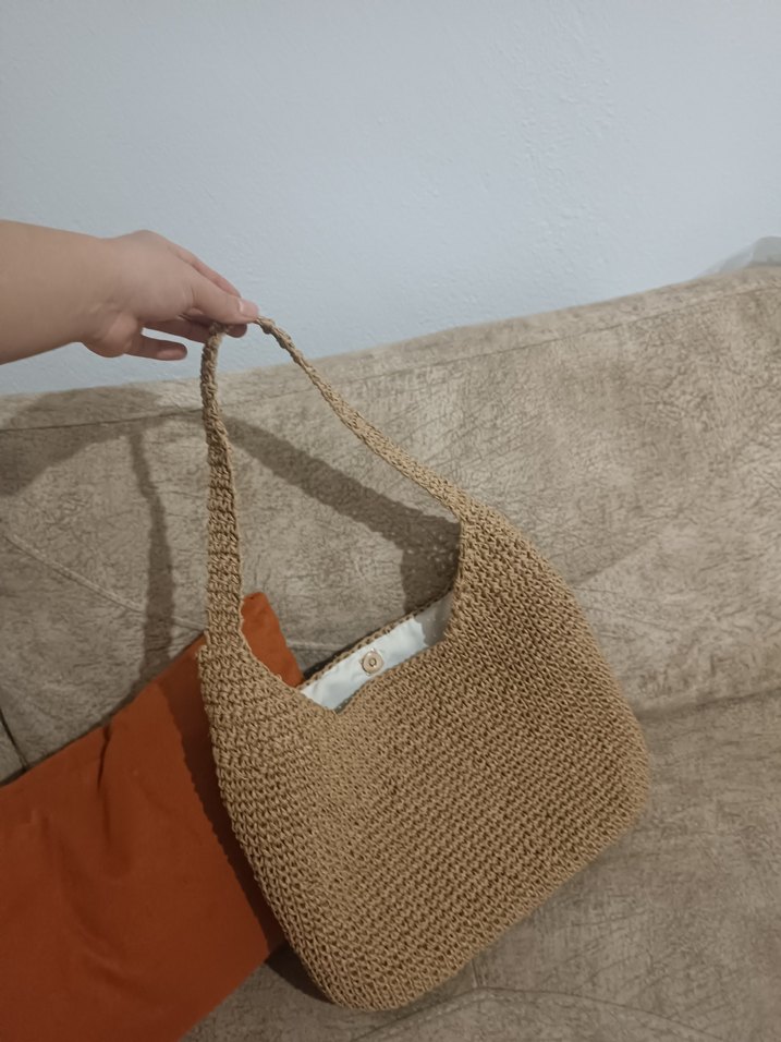Bej renkli, örgü dokulu kadın çantasıdır. Minimalist ve bohem tarzda, desen içermeyen günlük kullanım için uygundur.
