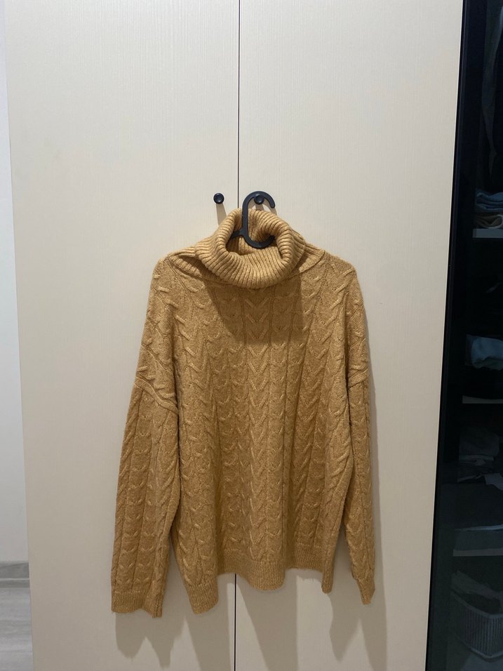 Bej renkli, örgü dokulu, balıkçı yaka ve uzun kollu kadın kazak, rahat kesimiyle günlük kullanıma uygundur. xs s bedendir herhangi bir sorunu yoktur