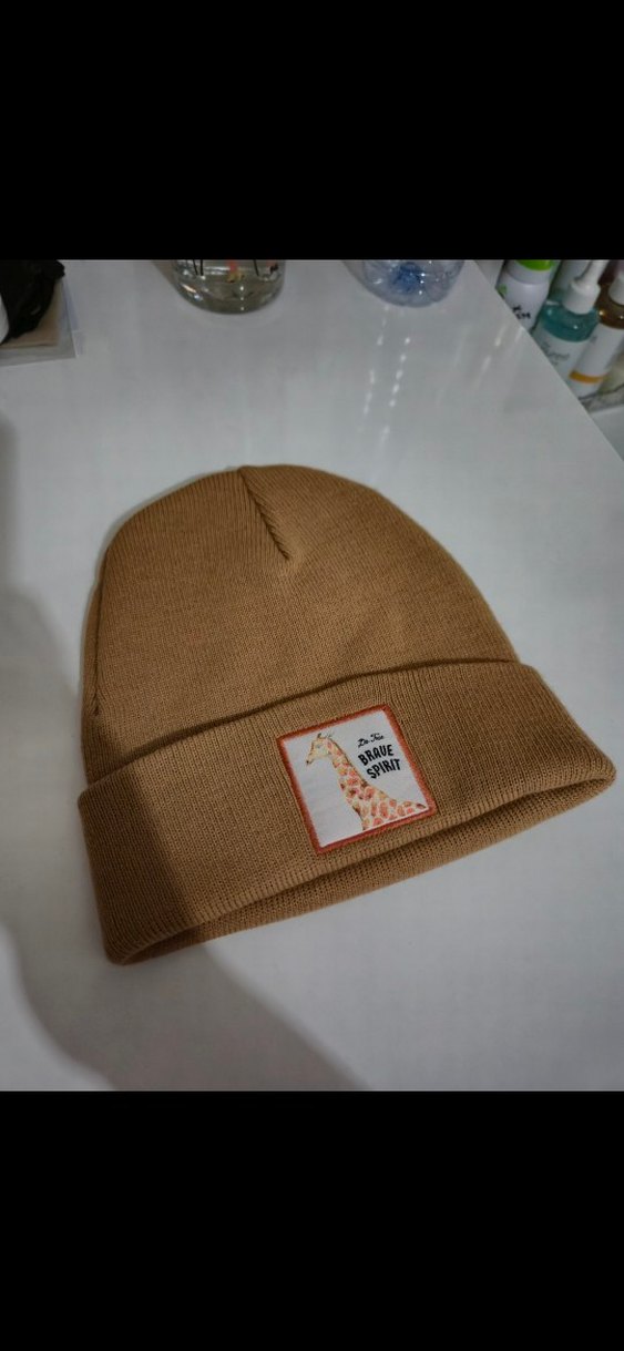 Yumuşak ve sıcak kumaşlı, zürafa patch detaylı bej örgü kadın bere. Trendy rahat stil için uygun.