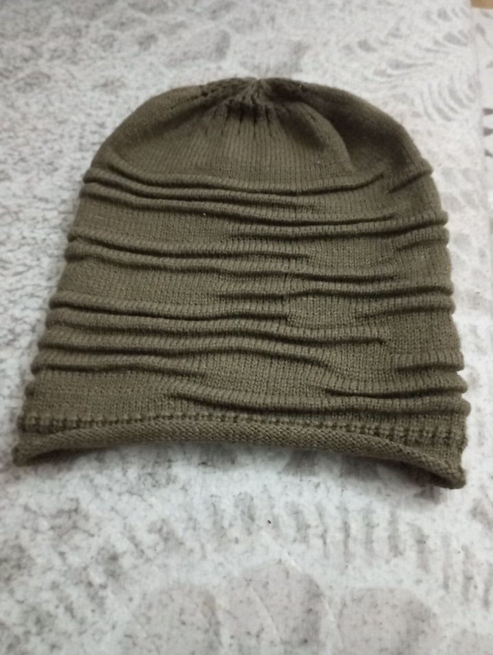 Bej renkli, yumuşak örgü kumaştan yapılmış kadın bere, dokulu deseniyle rahat ve sade bir tarz sunar.