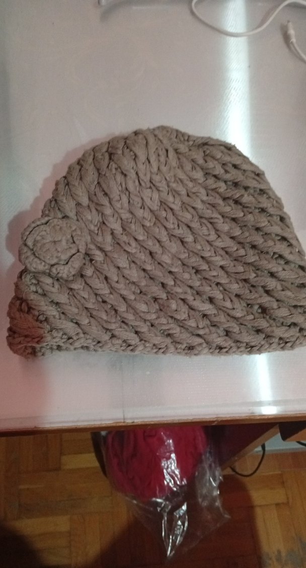 Bej renkli, örgü tasarımlı kadın bere, rahat dokusu ve küçük çiçek detaylarıyla bohem tarzı yansıtır.