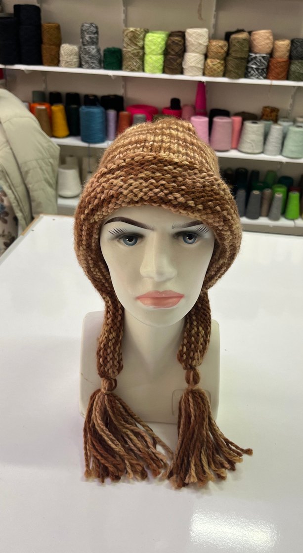 Püsküllü, bej örgü kadın bere, hafif bohem tarzıyla rahat ve retro görünüme uygun.