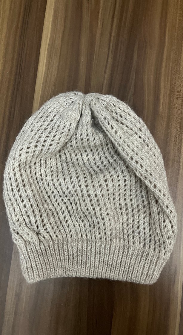 Bej renkli, örgü kumaştan yapılmış, rahat ve sade tarzda kadın bere.