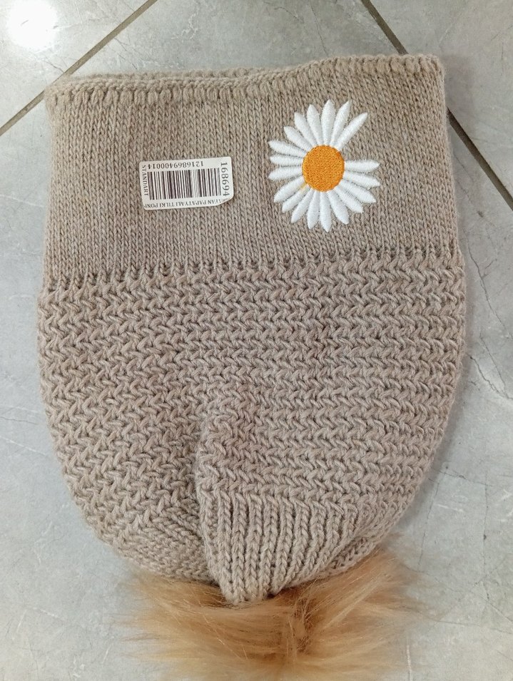 Bej renkli, örgü kadın bere, papatya nakışı ve yumuşak ponpon detayına sahip, rahat ve bohem tarzda.