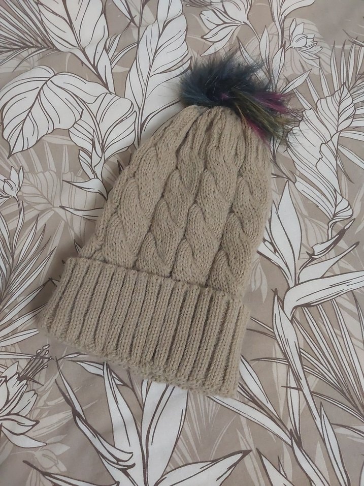 Bej renkli, kalın örgüden yapılmış kadın bere, renkli sahte kürk ponpon ile bohem tarzı ve sıcaklık sağlar.