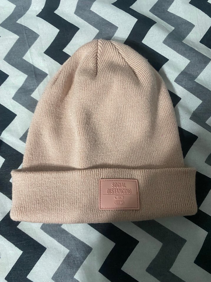 Pastel tonlarda, örgü bej yün bere. Katlanabilir kenar ve "SOCIAL DISTANCING" yazılı etiket bulunur. Rahat ve trend sokak stili için uygun.