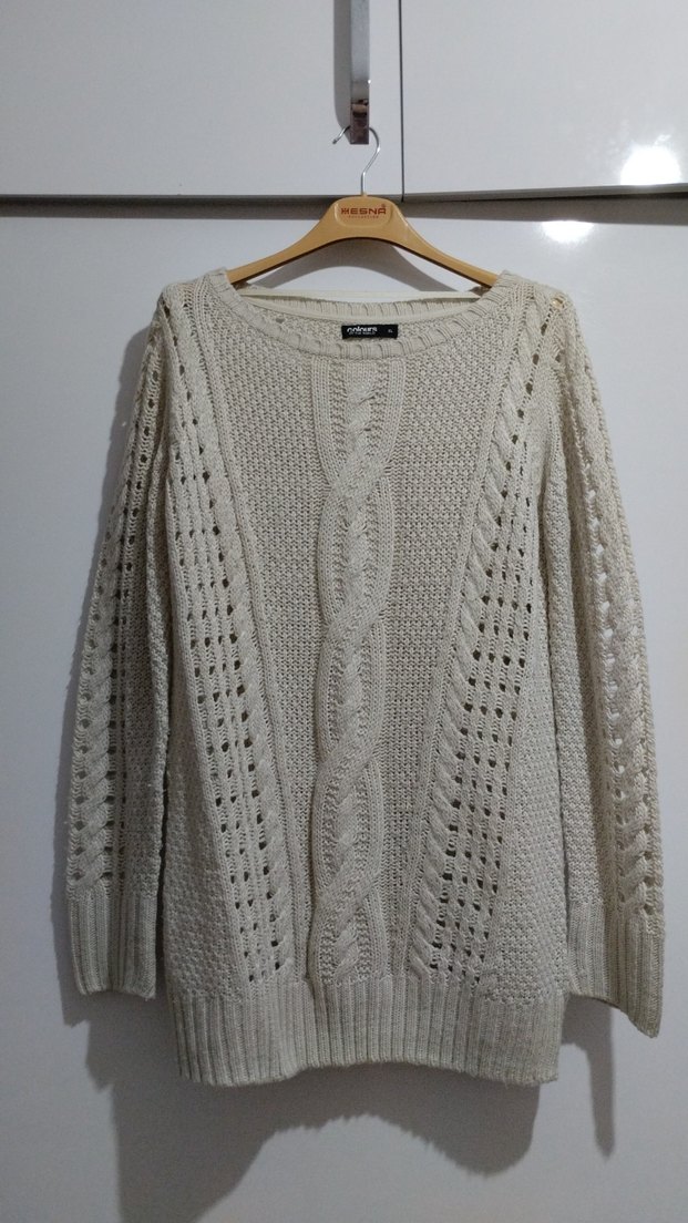 Bej renkli, uzun kollu ve yuvarlak yakalı örgü kazak. Bol kesim ve normal boyda, bohem tarzıyla günlük kullanıma uygun rahat bir modeldir.