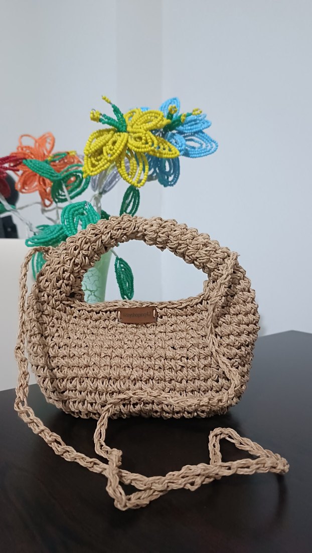 Hasır ipten örgü bej kadın çantası, bohem tarzıyla günlük kullanıma uygun.