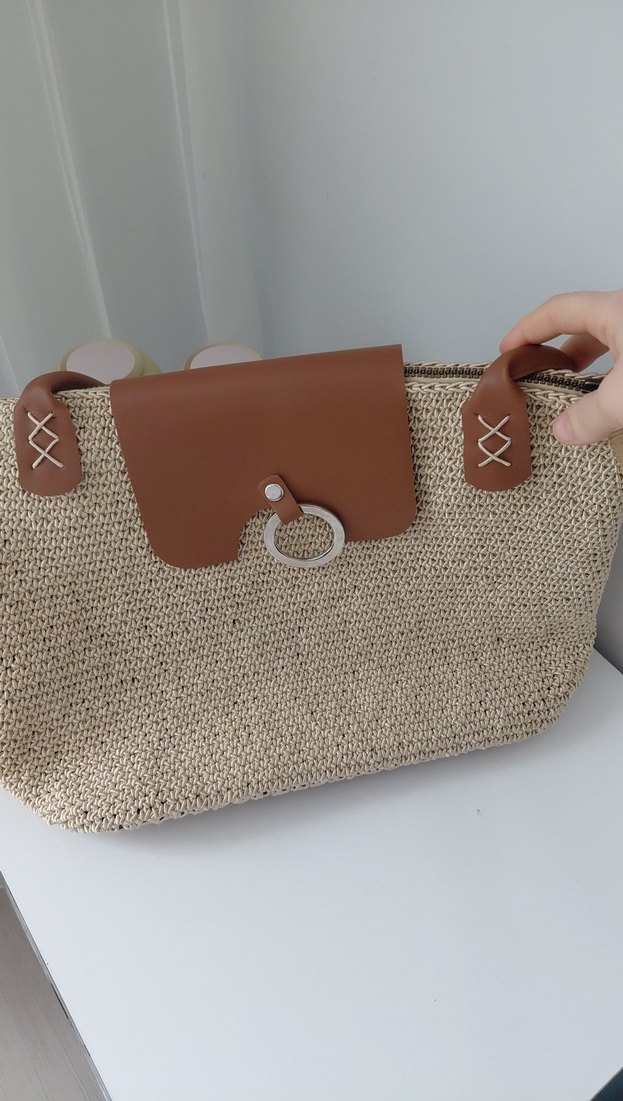 Bej renkli, örgü kumaştan yapılmış kadın çantası, tokalı kapağı ile minimal ve bohem tarzları birleştirir. Günlük kullanım için uygundur.