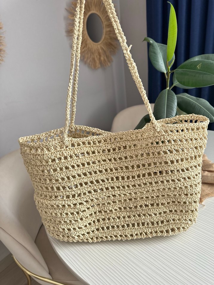 Hafif bej renkli, dantelli örgü kadın çanta, bohem tarzda ve uzun saplı, günlük kullanıma uygun.