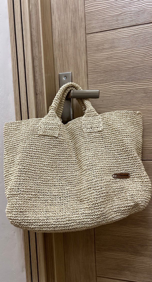 Günlük kullanıma uygun, sade ve minimalist tasarımlı bej örgü kadın çanta. Bohem tarzda, yumuşak örgü dokusu ile. El Yapımı