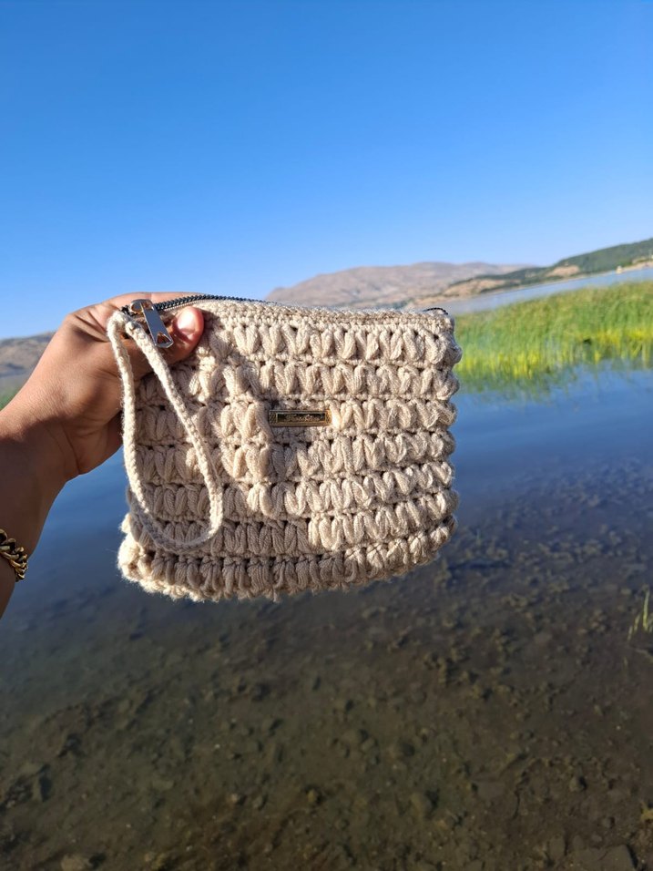 Bej renkte, yumuşak dokulu örgü kadın çantasıdır. Bohem tarzı ve dış mekan kullanımı için uygundur. Taşıma kolaylığı sağlayan bilek askısı bulunur. El emeğidir.