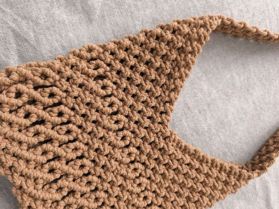 Bej renkli, örgü dokusuyla bohem tarzda kadın çanta. Rahat ve sade tasarımı günlük kullanım için uygundur.