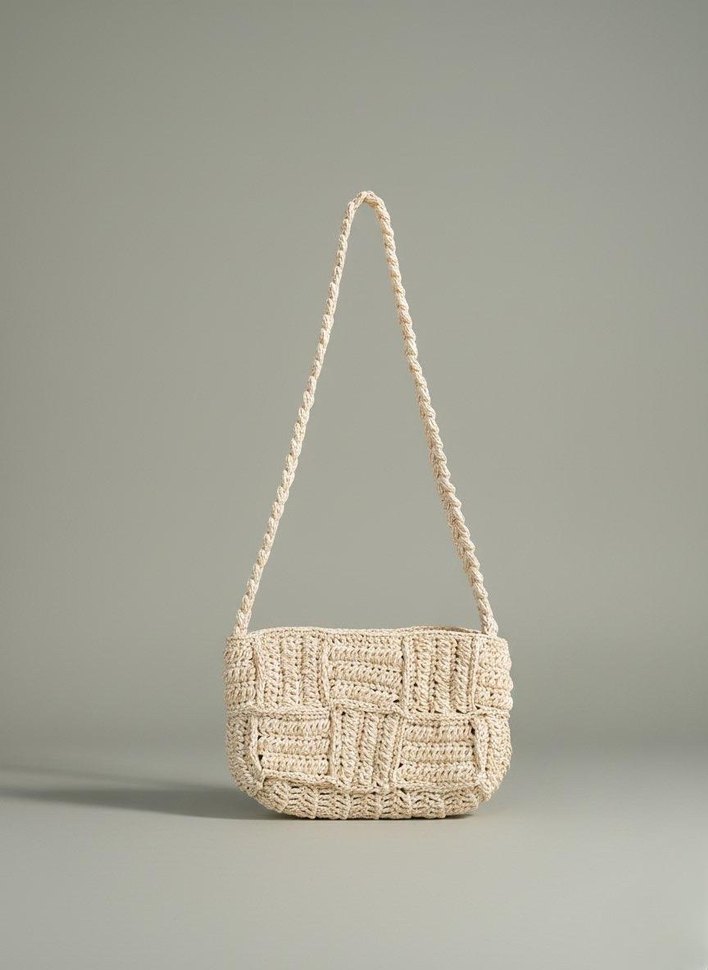 Bej renkli, örgü dokulu kadın çantasıdır. Minimalist ve bohem tarzıyla günlük kullanıma uygundur.