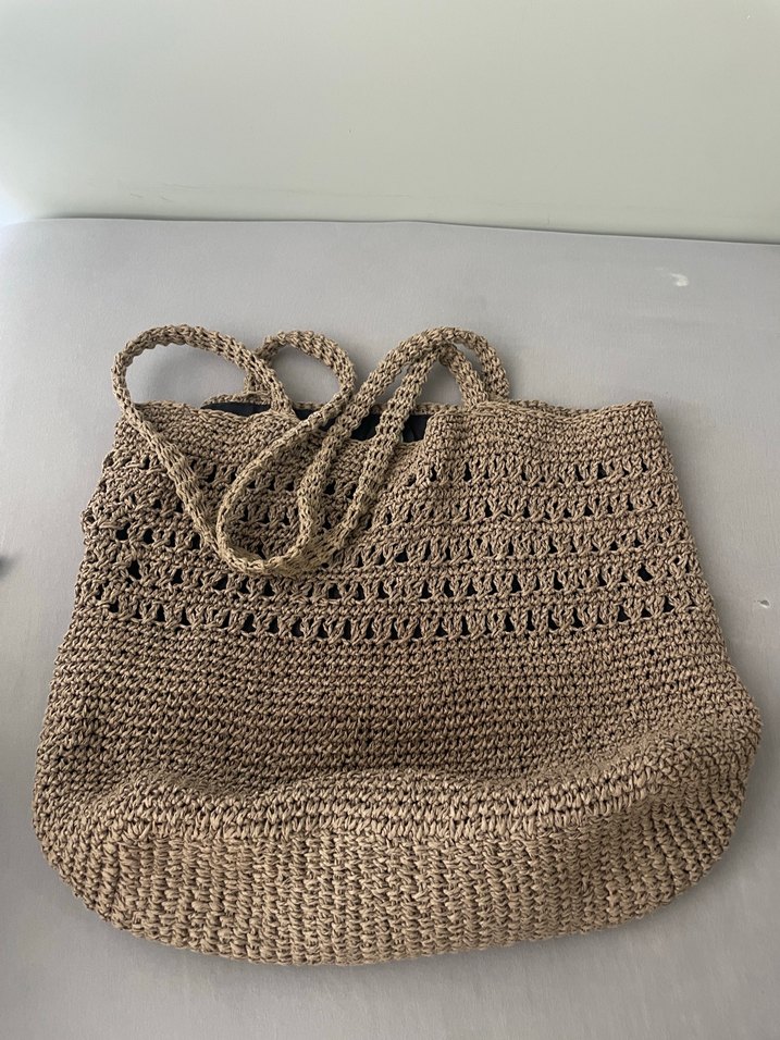 Bej renkli, örgü dokulu kadın çanta. Koyu iç astar ve mıknatıslı kapanışa sahip, bohem tarzı için uygun.