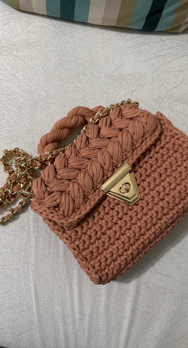 Bej renkli, örgü dokulu kadın çanta. Altın zincir askılı, rahat ve bohem tarzıyla günlük kullanıma uygun.