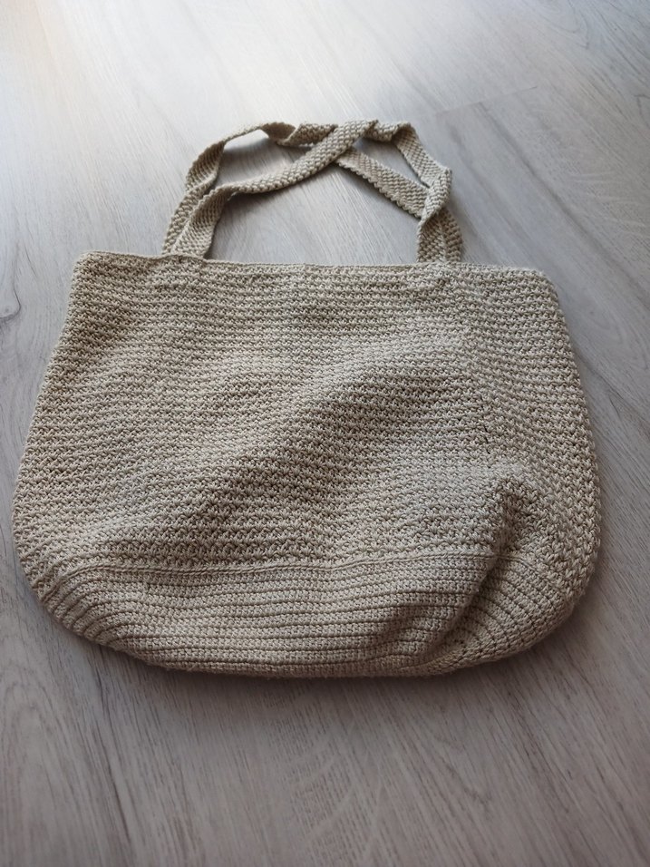 Yumuşak örgü kumaştan yapılmış bej renkli, sade ve minimal bohem tarzda günlük kullanıma uygun kadın çantası.