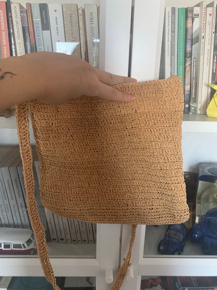 Bej renkli, örgü kumaştan kadın çanta. Hasır çanta