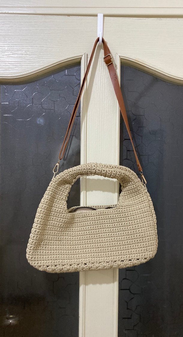 Bej renkli, yumuşak örgü dokulu, kahverengi çıkarılabilir askılı bohem tarz kadın çantası.