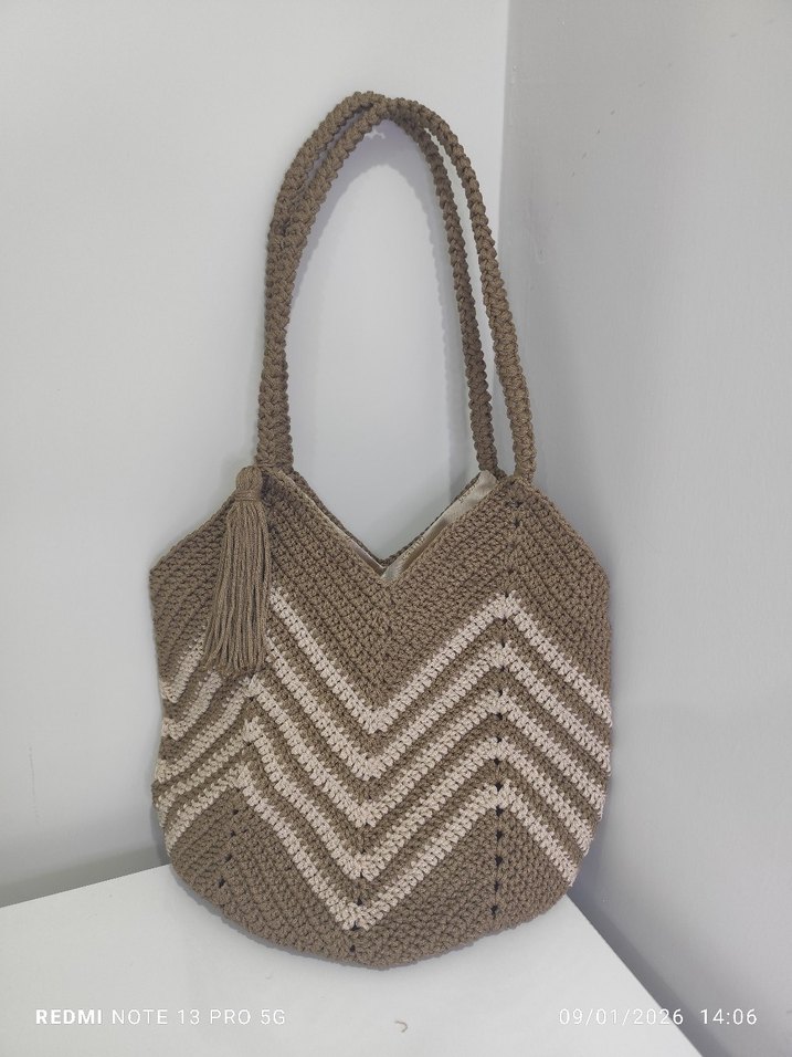 Bej renkte, dantel detaylı ve zebra desenli örgü kadın çantası. Bohem tarzda, günlük kullanıma uygun.