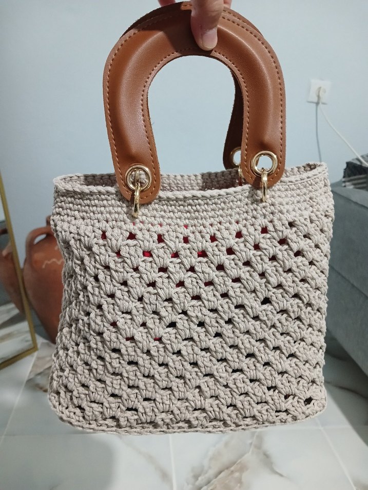 Bej renkli örgü kadın çanta, deri sapları ve dantel esintili örgü deseniyle bohem tarzı yansıtıyor.