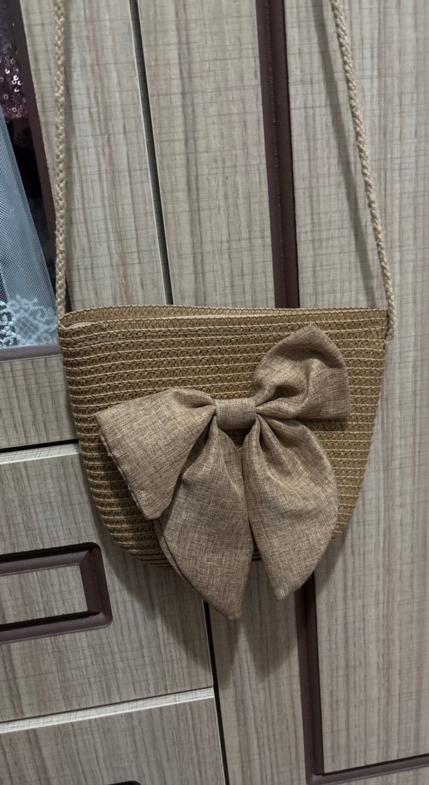 Bej renk örgü kadın çanta, büyük fiyonk detayı ve bohem tarzıyla. Günlük kullanım için uygun, desensiz tasarım.
