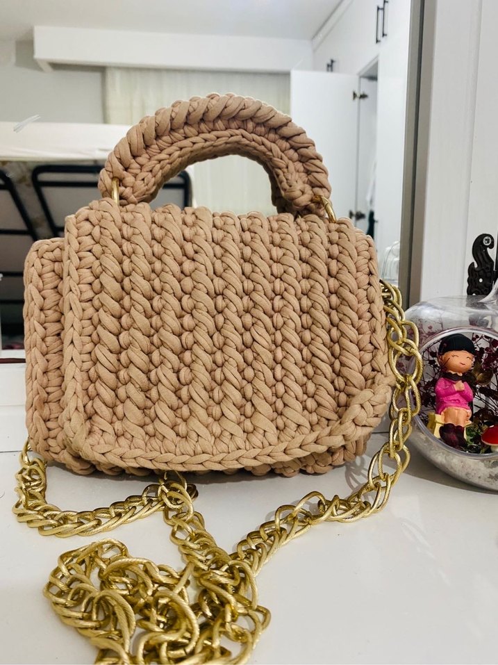 Bej renkli, örgü dokulu kadın çantası, altın zincir detayıyla rahat ve bohem bir tarz sunar.