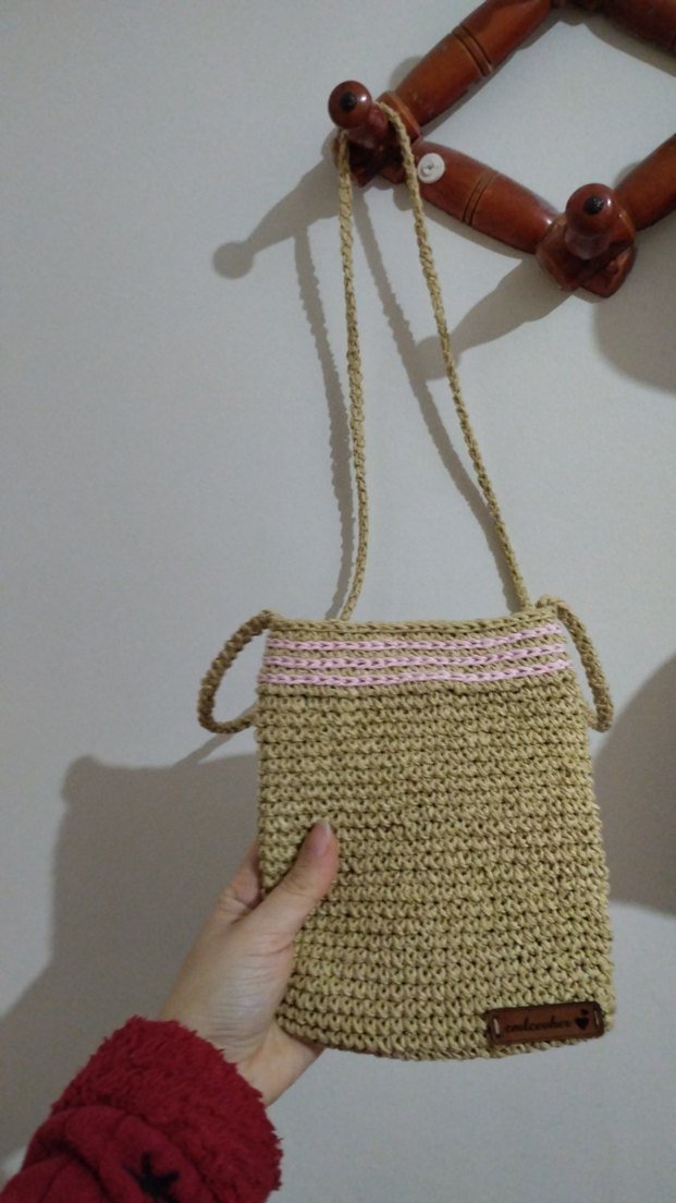 Bej renkli, örgü dokulu, ince pembe detaylı çapraz çanta. Minimalist ve bohem tarzda, günlük kullanıma uygun yumuşak malzeme.