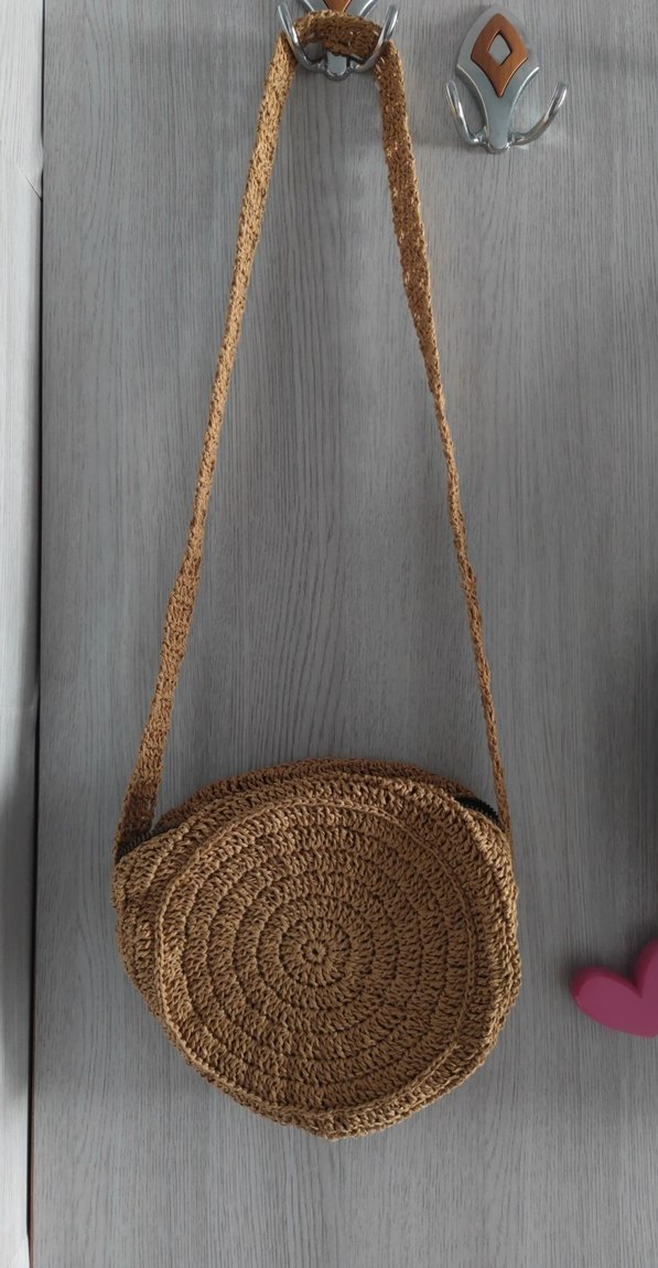 Bej renkli, örgü örme malzemeden yuvarlak kadın çapraz çanta. Minimalist ve bohem tarzda, günlük kullanıma uygundur.