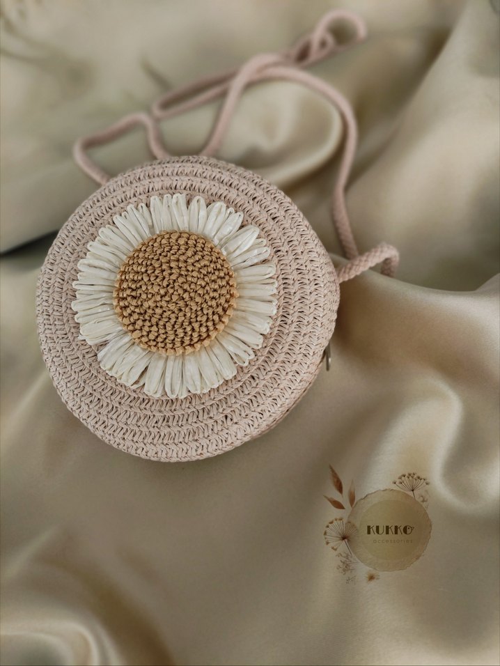 Bej renkte, çiçek desenli örgü dokusuyla bohem tarzda kadın çapraz çanta. Pastel tonlar ve yumuşak örgü kumaş ile retro ve hippie havası taşır.