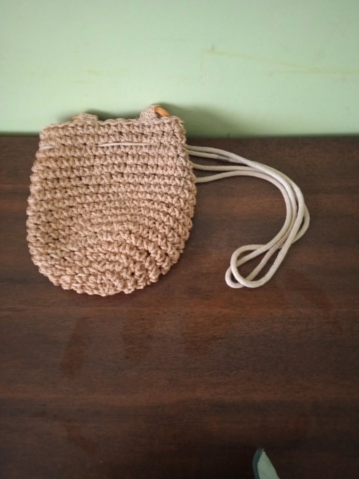 Bej örgü kumaştan yapılmış, minimalist ve bohem tarzda, günlük kullanıma uygun kadın çapraz çanta. Yumuşak dokulu, desensiz tasarım.