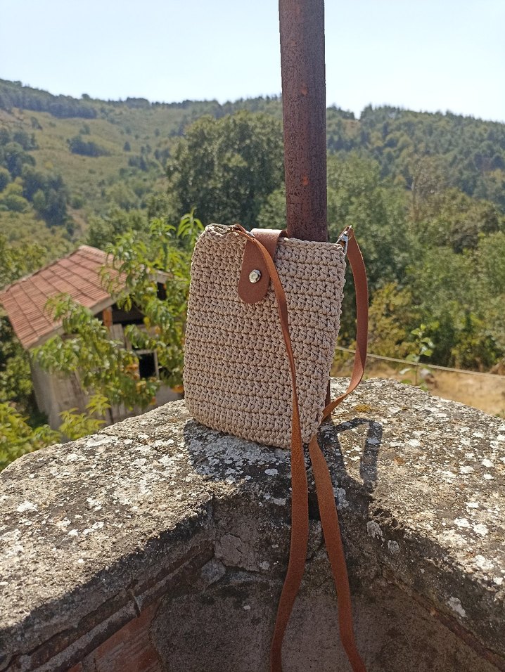 Bej renkli, örgü dokulu, kemerli ve deri askılı çapraz çanta. Minimalist bohem tarzda, açık hava kullanımı için uygun.